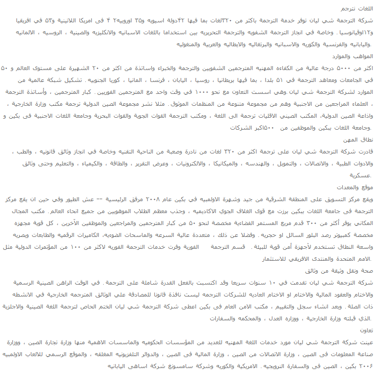 شركة الترجمة شي ليان توفر خدمة الترجمة باكثر من ۳۲۰لغات بما فيها ۴۲دولة اسيويه و۳۵ اوروبيه۲ ۴ فى امريكا اللاتينية و۵۳ في افريقيا و۱۲اوقيانوسيا. وخاصة في انجاز الترجمة الشفويه والترجمة التحريريه بين استخداما باللغات الاسبانيه والانكليزيه والصينية ، الروسيه ، الالمانيه واليابانيه والفرنسية والكوريه والاسبانيه والبرتغاليه والايطاليه والعربية والمنغوليه.