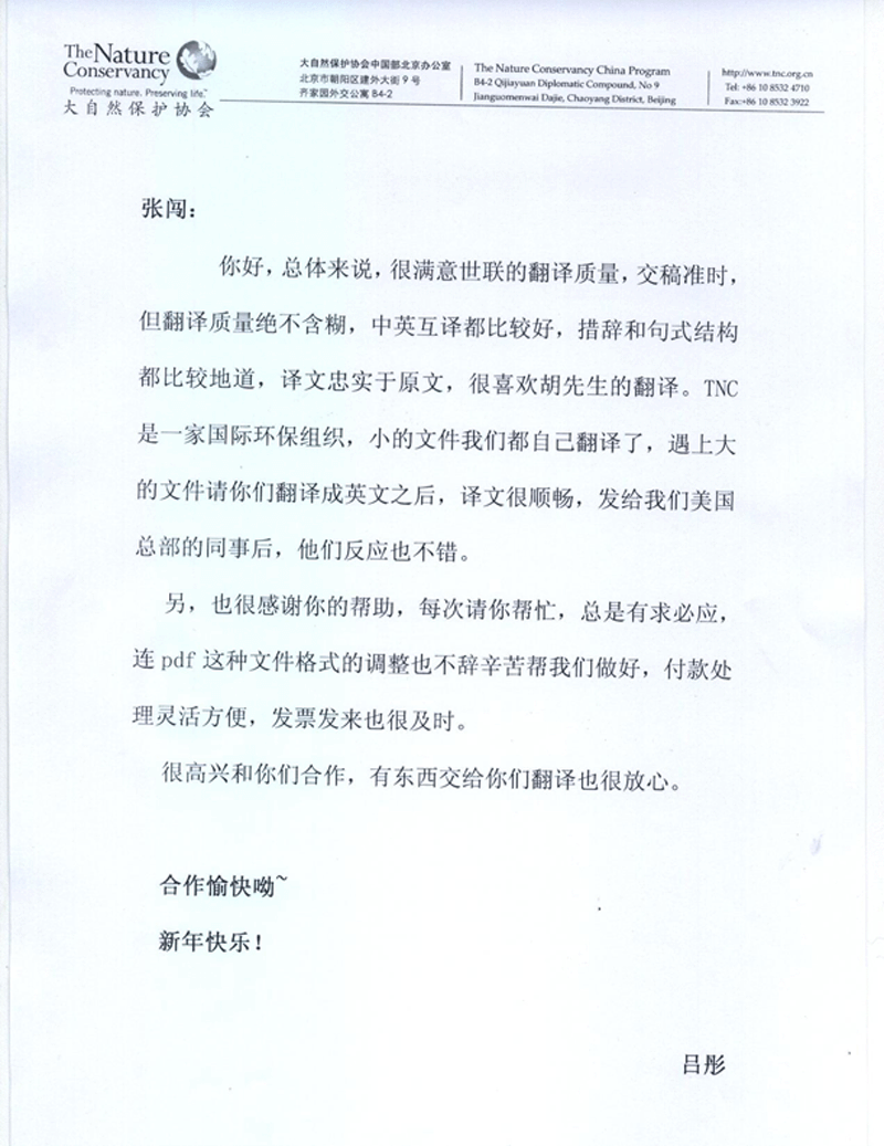 大自然保護協(xié)會反饋--北京世聯(lián)博眾翻譯怎么樣?