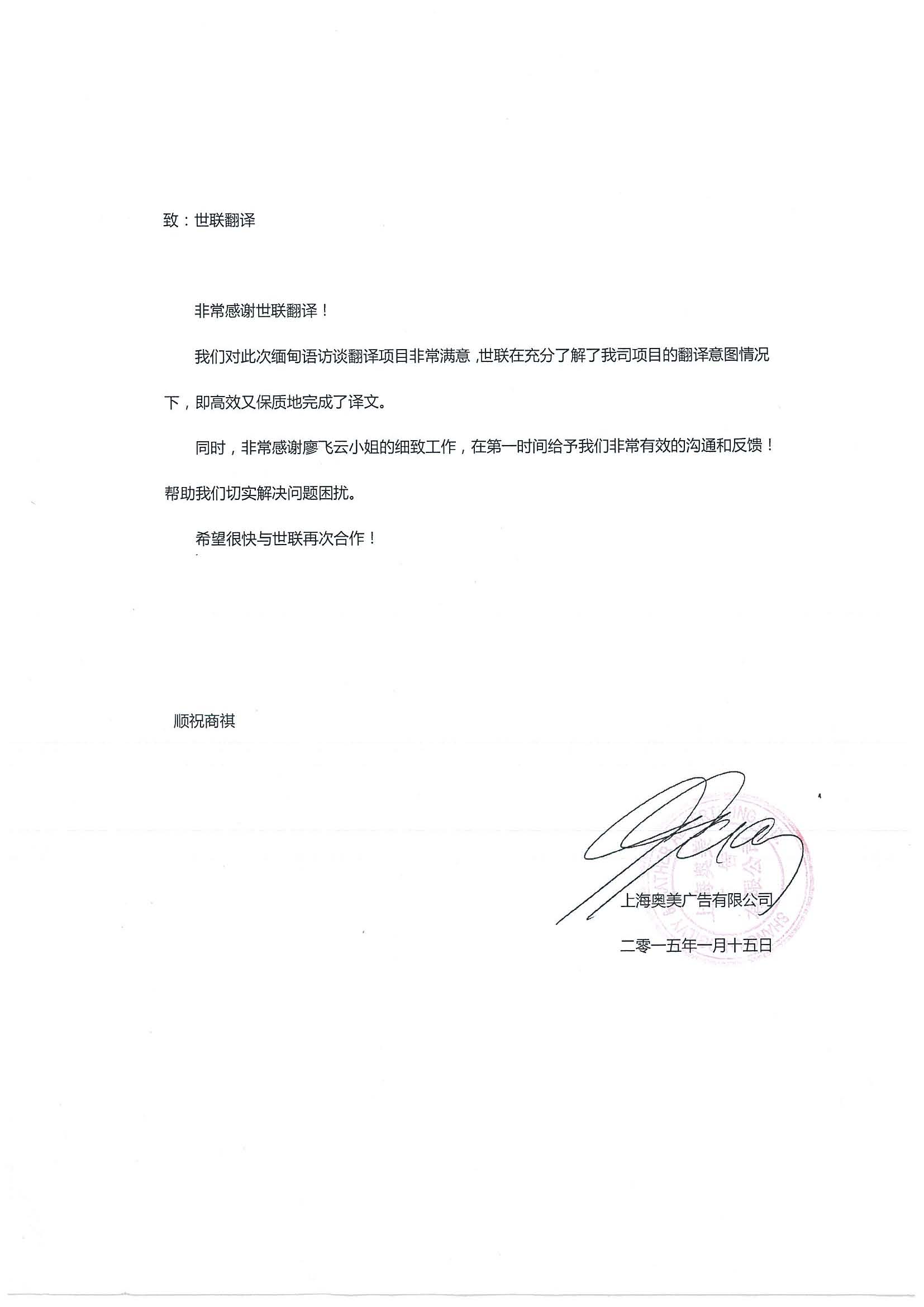 非常感謝世聯(lián)翻譯!