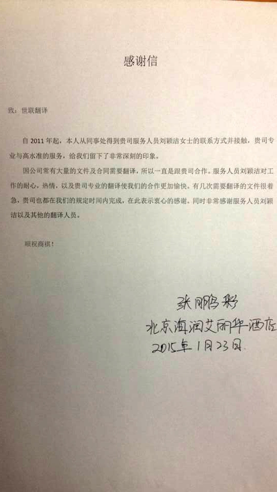 海潤酒店對世聯翻譯的評價!
