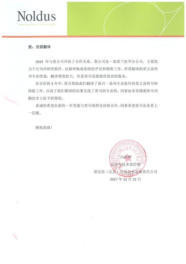 諾達(dá)思(北京)信息技術(shù)有限責(zé)任公司致世聯(lián)翻譯一封信